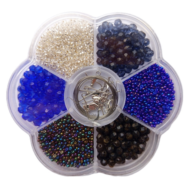 Z této korálkové tvořivé sady lze vytvořit náhrdelník nebo náramky a náušnice. Sada obsahuje: SKLENĚNÉ KORÁLKY v různých barvách a dekorech, KOVOVÉ KORÁLKY, KOVOVÉ KOMPONENTY: lanko na navlékání, karabinka, protikroužek, 4x afroháček na náušnice, 2x nýtek, zamačkávací rokaily. Průměr krabičky je cca 10,5 cm.