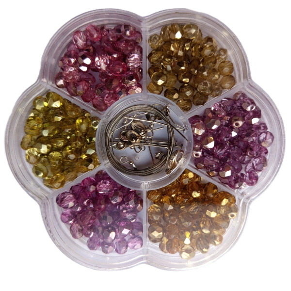 Z této korálkové tvořivé sady lze vytvořit náhrdelník nebo náramky a náušnice. Sada obsahuje: SKLENĚNÉ KORÁLKY v různých barvách a dekorech, KOVOVÉ KORÁLKY, KOVOVÉ KOMPONENTY: lanko na navlékání, karabinka, protikroužek, 4x afroháček na náušnice, 2x nýtek, zamačkávací rokaily. Průměr krabičky je cca 10,5 cm.