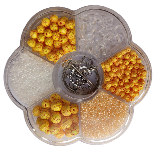 Z této korálkové tvořivé sady lze vytvořit náhrdelník nebo náramky a náušnice. Sada obsahuje: SKLENĚNÉ KORÁLKY v různých barvách a dekorech, KOVOVÉ KORÁLKY, KOVOVÉ KOMPONENTY: lanko na navlékání, karabinka, protikroužek, 4x afroháček na náušnice, 2x nýtek, zamačkávací rokaily. Průměr krabičky je cca 10,5 cm.