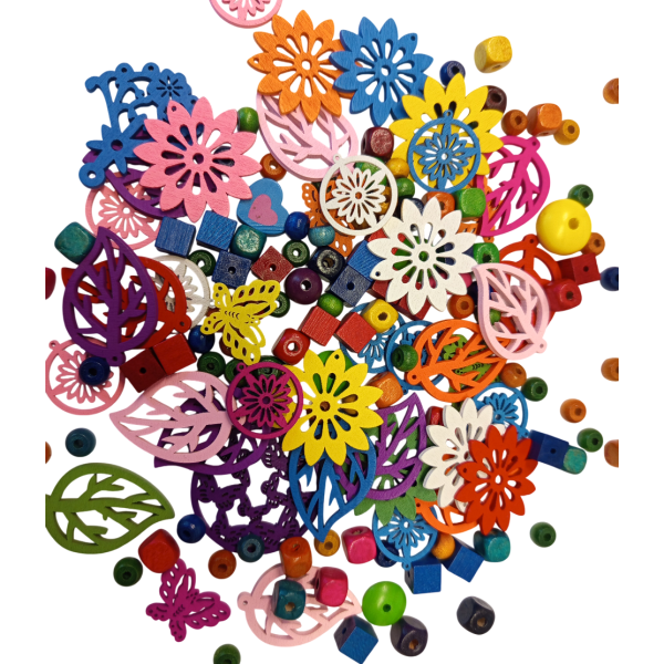 Mix dřevěných korálků. Různé tvary, barvy a velikosti korálků a filigránů. Velmi zdařilý mix. Váha balení 130g. Váha balení 130g. Vodné pro výrobu různých dekorací, přívěsků, náušnic, ozdob na vánoční stromeček atd.