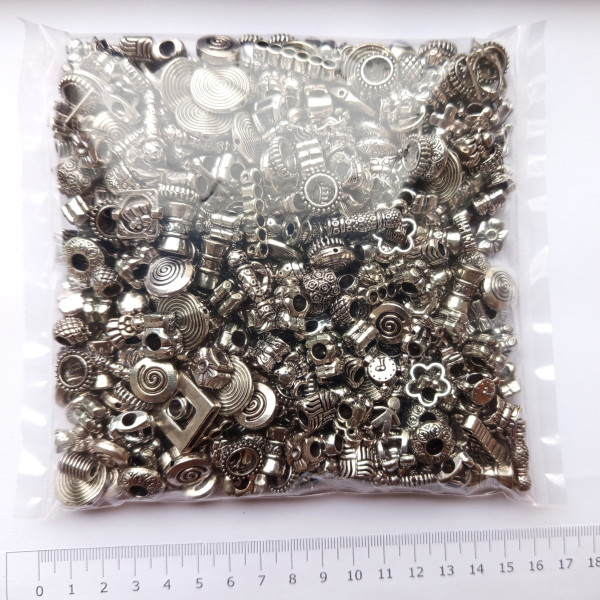 Mix kovových bižuterních korálků 1000 g, ideální na tvoření různých náhrdelníků, náušnic, přívěsků a náramků nebo dekorací. Obsahuje cca 930 ks přívěsků v glavanizaci stříbro, platina, starostříbro. Obsahuje mnoho různých tvarů a velikostí. V každém balení originální mix komponentů. Může být použito i v různých tvořivých kolektivech - velké MAXI balení.