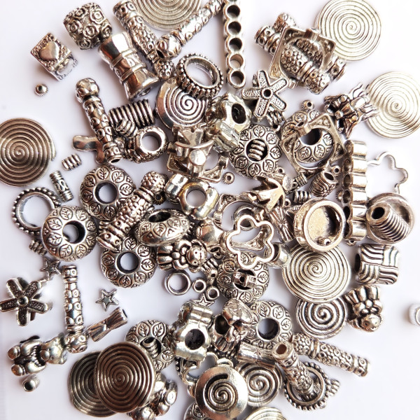 Mix kovových bižuterních korálků 300 g, ideální na tvoření různých náhrdelníků, náušnic, přívěsků a náramků nebo dekorací. Obsahuje cca 280 ks přívěsků v glavanizaci stříbro, platina, starostříbro. Obsahuje mnoho různých tvarů a velikostí. V každém balení originální mix komponentů. Může být použito i v různých tvořivých kolektivech - velké MAXI balení.