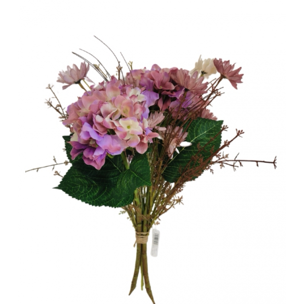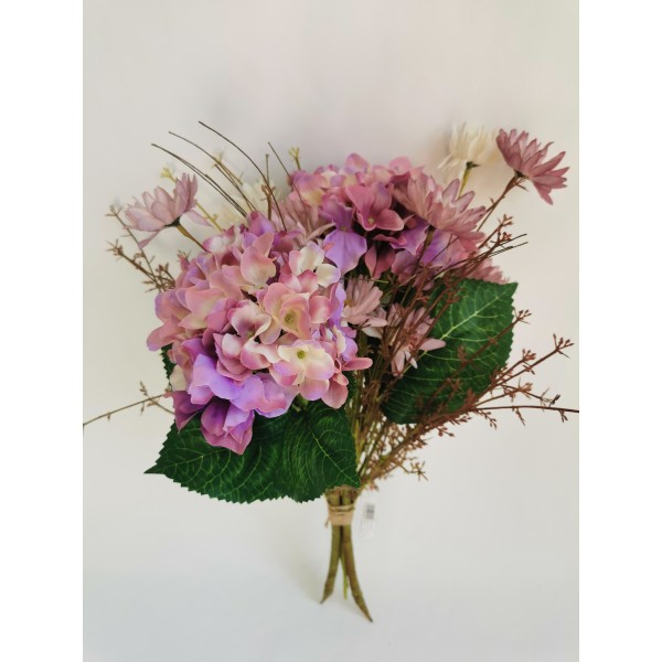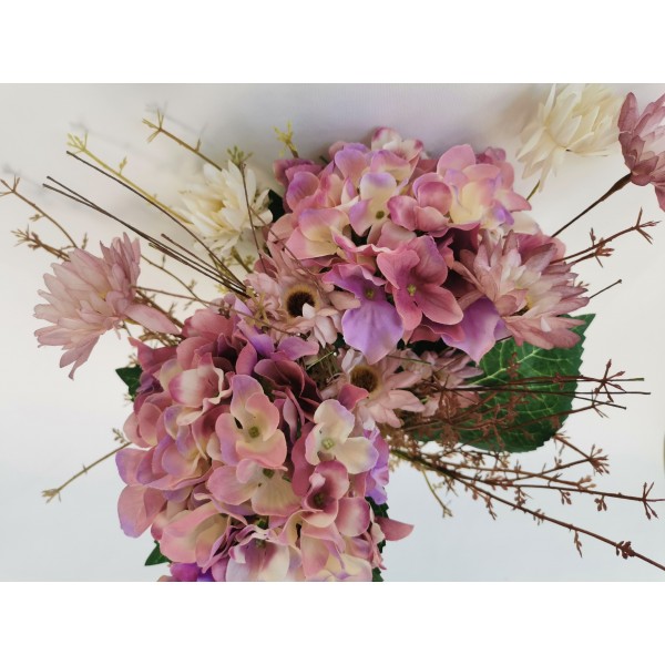 Umělá kytice hortenzie v barvách - růžová, starorůžová, fialová, krémová. Použité květiny - 2x hortenzie fialovo-růžová, 2x luční kopretiny (krém a starorůžová); celkem 4 květiny v. 50 cm; více viz popis..