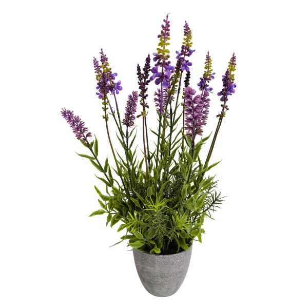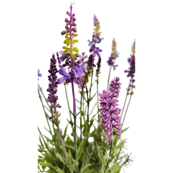 Levandule v šedém plastovém květináči - 18 květů; celková výška 43 cm, průměr květináče 10 cm, květy cca 6 cm. Velmi pěkné, realistické provedení.
