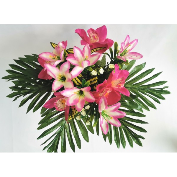 Kytice lilie, přízdoba a palmové listy, celkem 12 stonků (6 větších květů a 6 menších květů). V. 38 cm.