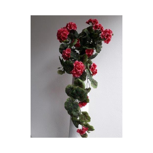 Muškátový převis tmavě růžový 4 květy nahoru a 3 šlahouny převislé, výška rostliny je 37 cm, délka nejdelšího převisu je 56 cm.