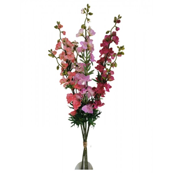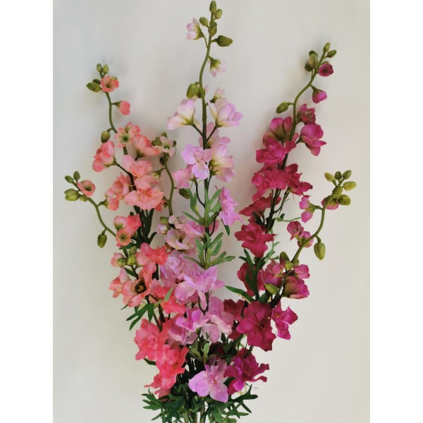 3 ks umělých květin delphinia svázané do kytice. V barvách sv. růžové, lososové a magenty. V. 100 cm; více viz popis..
