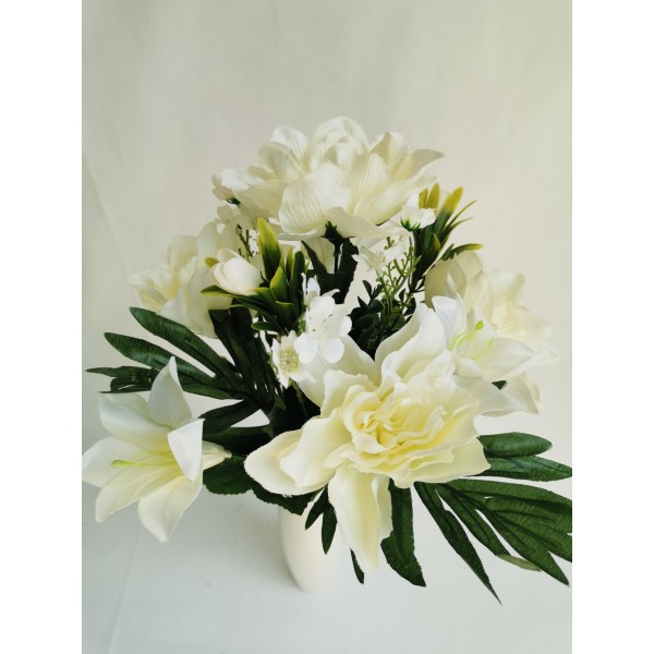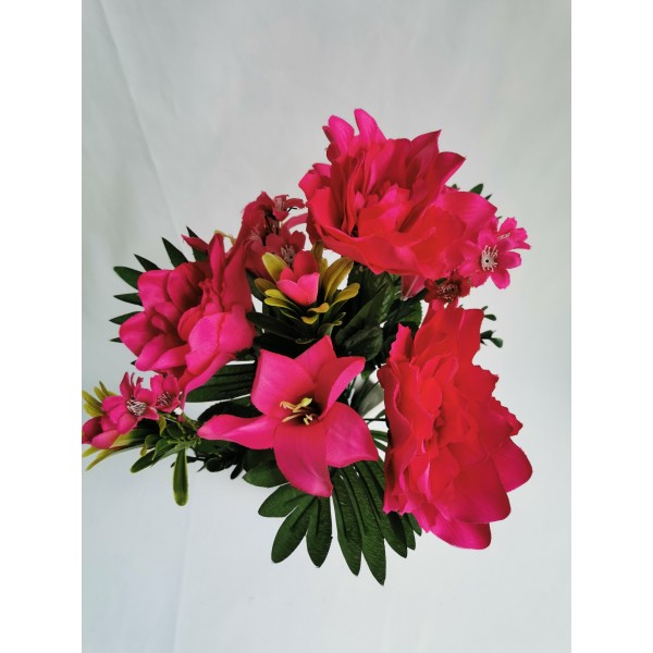 Kytice s palmovým listem - amarylis, lilie + drobné květy + přízdoba. V. 40 cm. Mat. plast a textil. 6 barevných variant.