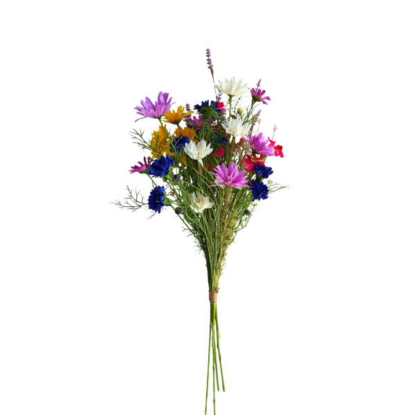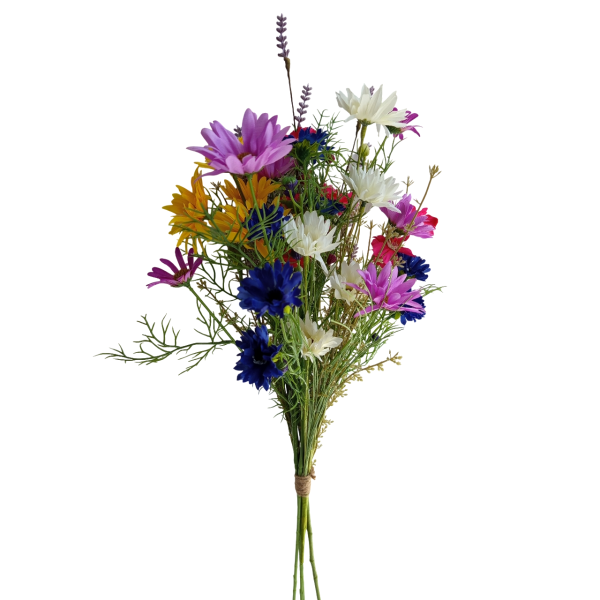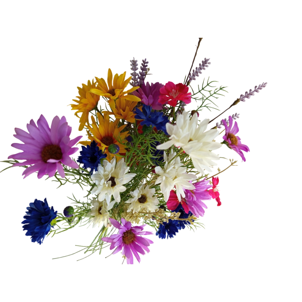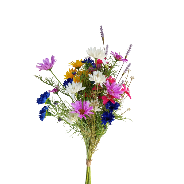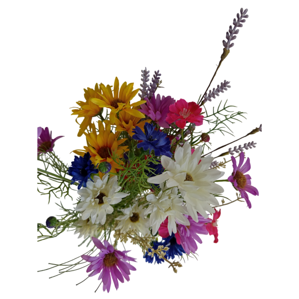 kytice kopretin a chrpy s přízdobou; 1x luční kopretina bílá, 1x chrpa modrá, 1x kopretina žlutá, 1x kopretina sv. fialová, 1x kosmos růžový, 1x luční kvítí lavender; výška cca 75 cm (možno přizpůsobit zkrácením stonků); velmi pěkná letní kytice svázaná dohromady rovnou do vázy