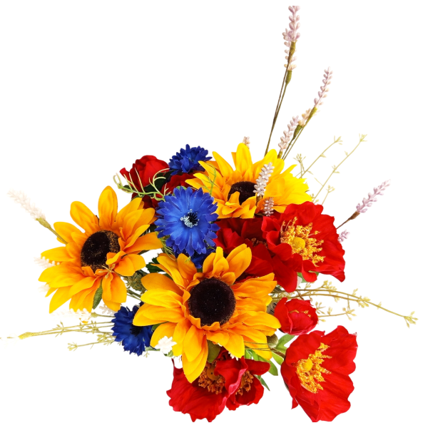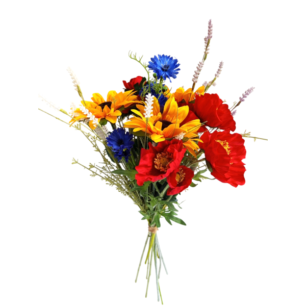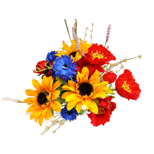 letní kytice slunečnice a máky s přízdobou; 3x slunečnice, 1x chrpa modrofialová, 1x luční kvítí bílé, 1x luční kvítí lavender, 1x anemonka červená, 2x vlčí mák červený; výška cca 75 cm (možno přizpůsobit zkrácením stonků); velmi pěkná letní kytice svázaná dohromady rovnou do vázy