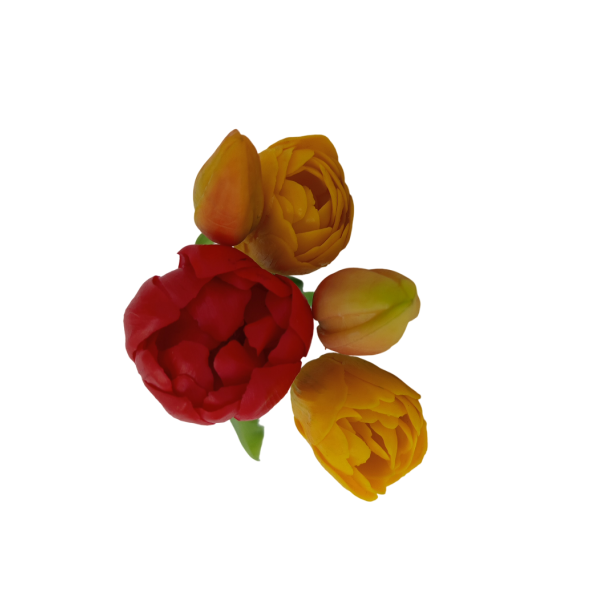 Svazek tulipánů; 5 ks; v. 39 cm; 2x poupě + 3x květ: 5x3,5 cm; materiál latex. Kvalitní a věrohodné provedení.