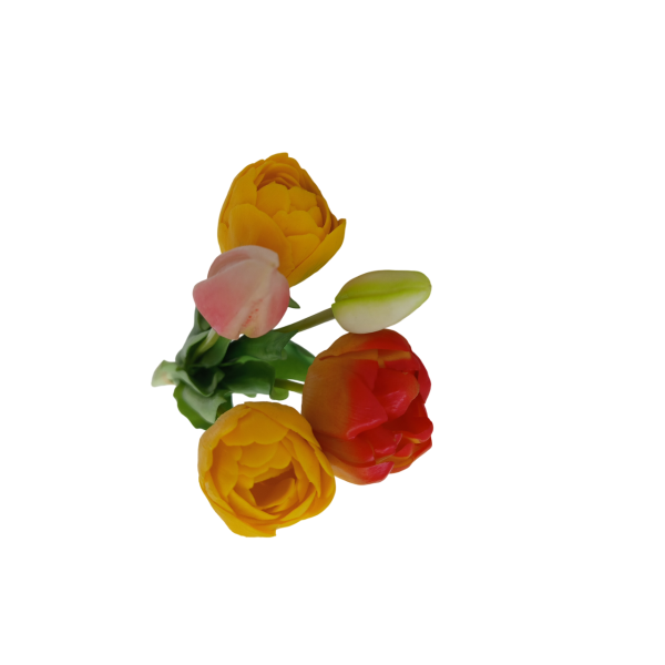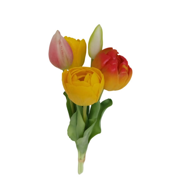 Svazek tulipánů; 5 ks; v. 39 cm; 2x poupě + 3x květ: 5x3,5 cm; materiál latex. Kvalitní a věrohodné provedení.