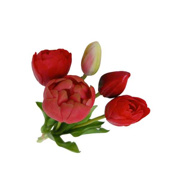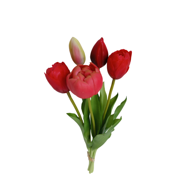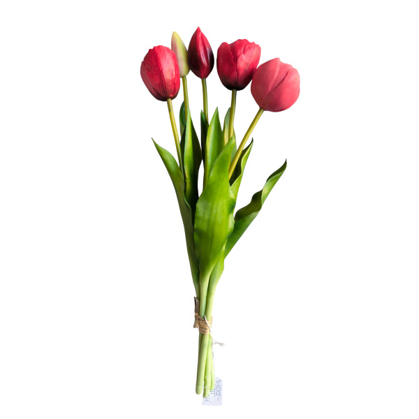Svazek tulipánů; 5 ks; v. 39 cm; 2x poupě + 3x květ: 5x3,5 cm; materiál latex. Kvalitní a věrohodné provedení.