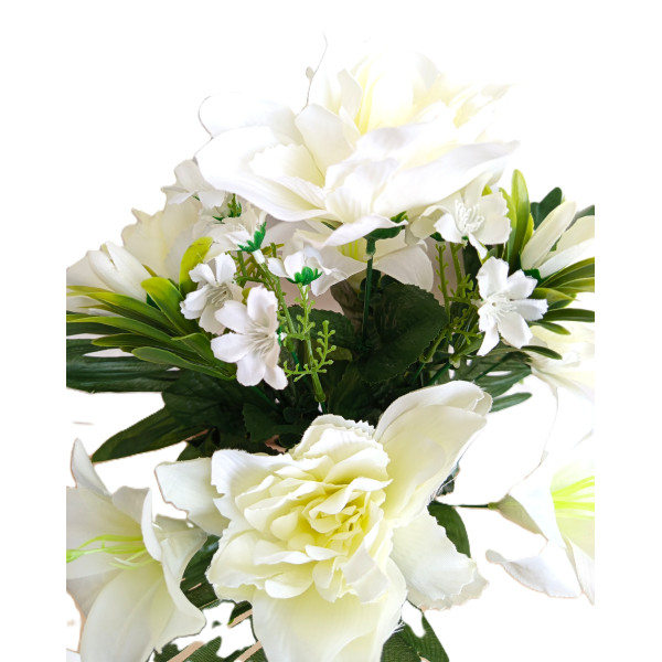 Kytice s palmovým listem - amarylis, lilie + drobné květy + přízdoba. V. 40 cm. Mat. plast a textil. 6 barevných variant.