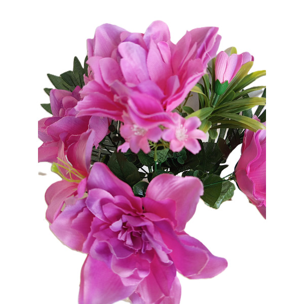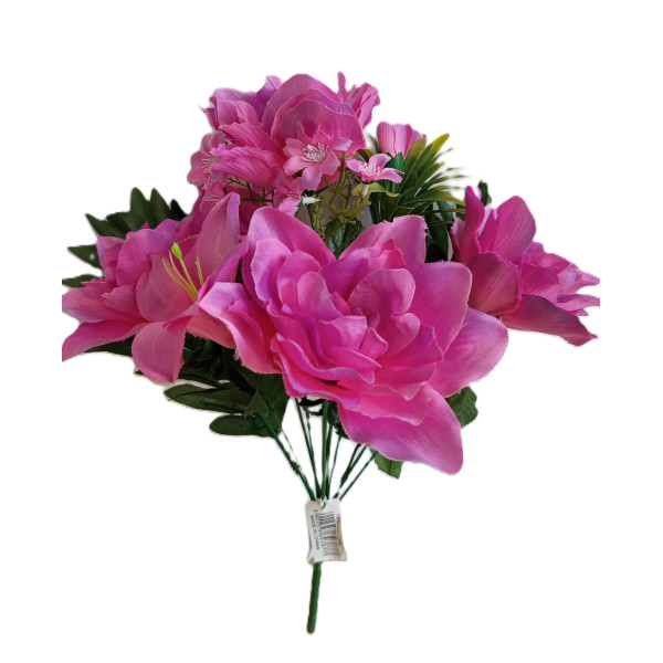 Kytice s palmovým listem - amarylis, lilie + drobné květy + přízdoba. V. 40 cm. Mat. plast a textil. 6 barevných variant.