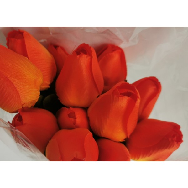 Pugét tulipánů v celofánu - 12 ks v pugétu. V. 60 cm, květ 7x4,5 cm. Cena za pugét. Barvy dle kombinací.