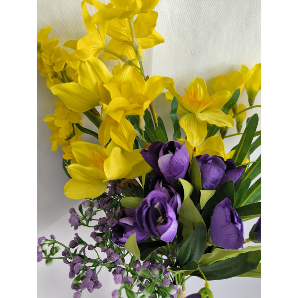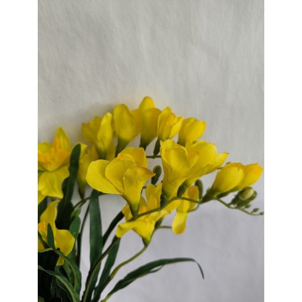kytice žluto-fialová; 4x žlutý narcis (3 typy), 2x žlutá frézie, 1x fialová gypsophila, 1x fialový krokus; výška cca 60 cm (možno přizpůsobit zkrácením stonků); velmi pěkná kytice svázaná dohromady rovnou do vázy