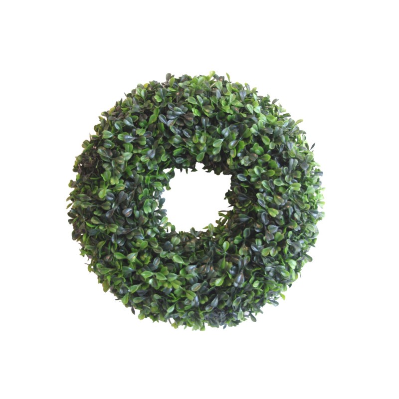 Luxusní buxusový věnec, 32 cm; lístky plast; zespodu kruh z tvrzeného polystyrenu.