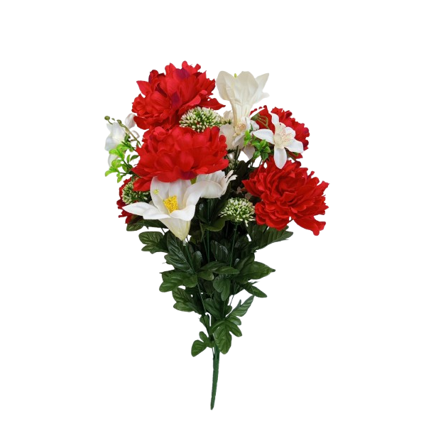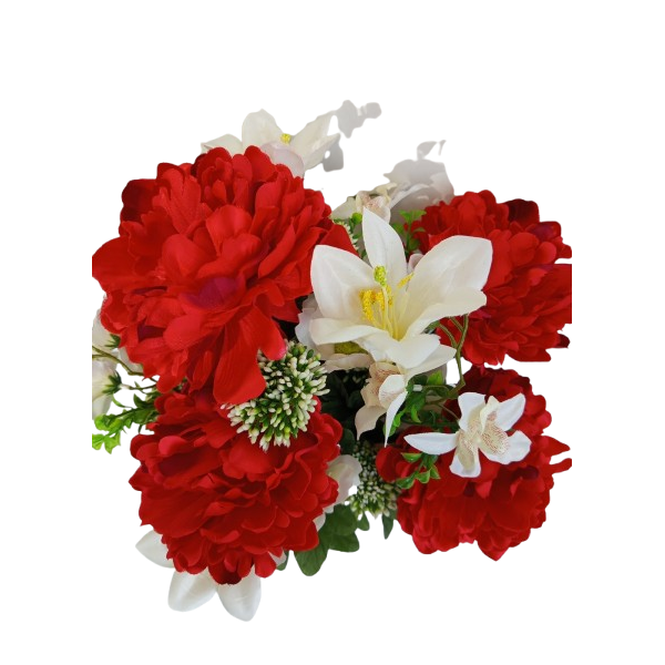 Kytice pivoněk (x5 květů), lilií, anemonek atd. (celkem 24 květů); v. 64 cm; moc pěkné, bohatě kvetoucí a věrohodné.