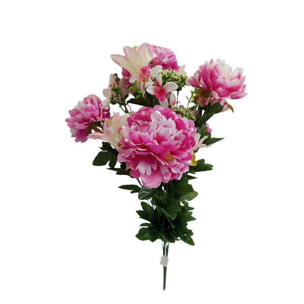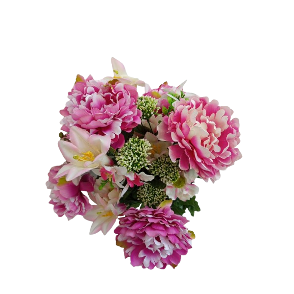 Kytice pivoněk (x5 květů), lilií, anemonek atd. (celkem 24 květů); v. 64 cm; moc pěkné, bohatě kvetoucí a věrohodné.