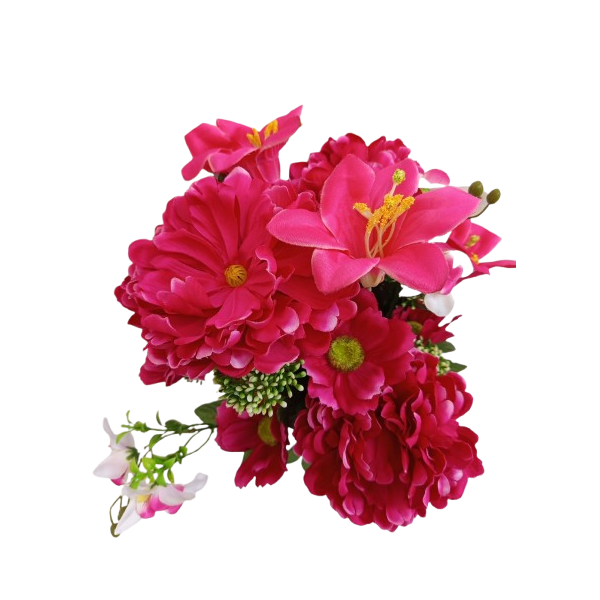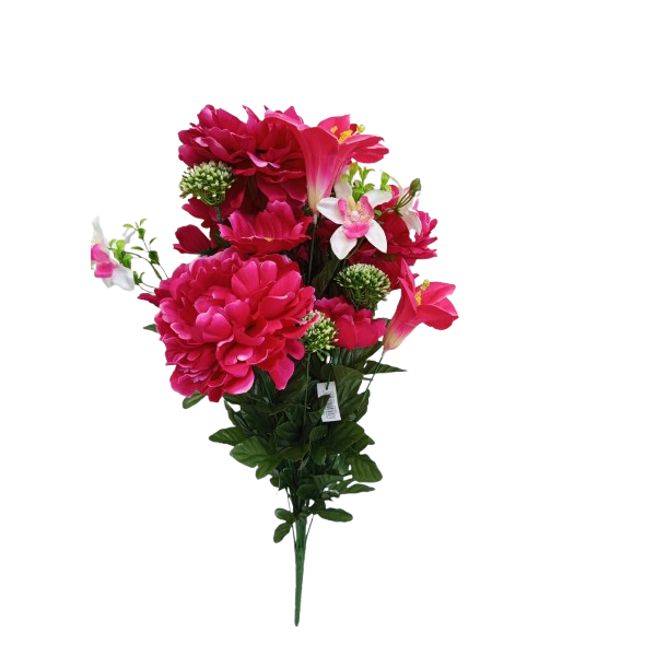 Kytice pivoněk (x5 květů), lilií, anemonek atd. (celkem 24 květů); v. 64 cm; moc pěkné, bohatě kvetoucí a věrohodné.