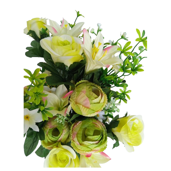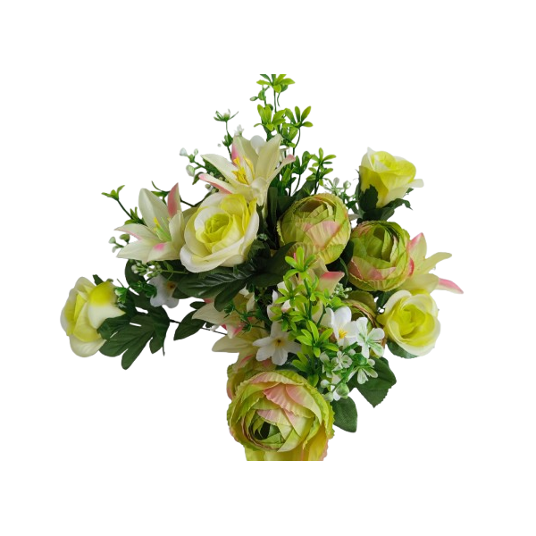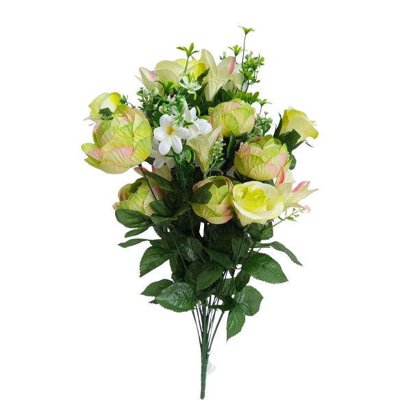 Kytice pivoněk (x6 květů), lilií (x6 květů), růží (x6 květů) atd.; v. 65 cm; moc pěkné, bohatě kvetoucí a věrohodné.