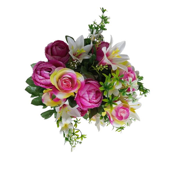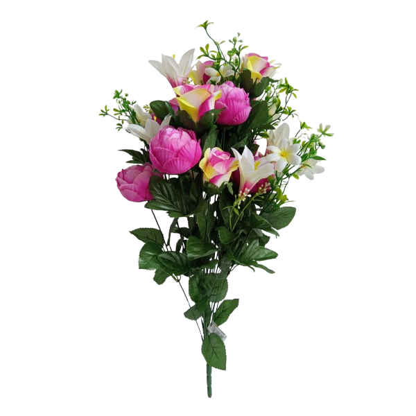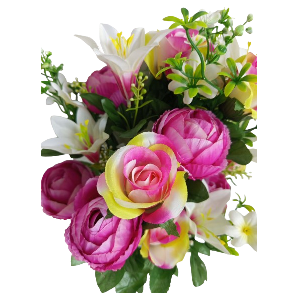 Kytice pivoněk (x6 květů), lilií (x6 květů), růží (x6 květů) atd.; v. 65 cm; moc pěkné, bohatě kvetoucí a věrohodné.