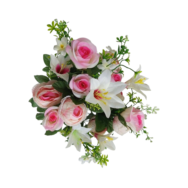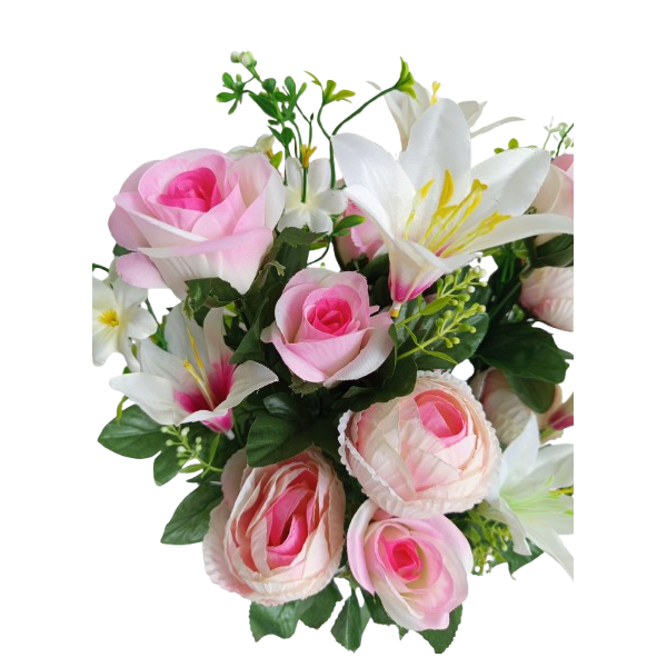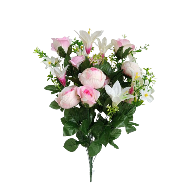 Kytice pivoněk (x6 květů), lilií (x6 květů), růží (x6 květů) atd.; v. 65 cm; moc pěkné, bohatě kvetoucí a věrohodné.