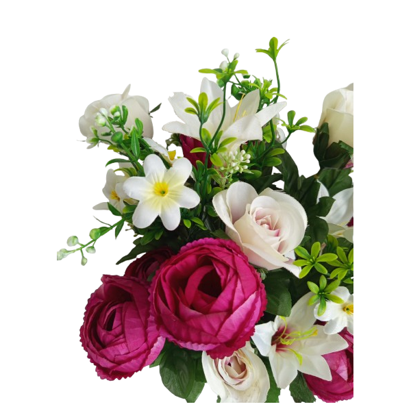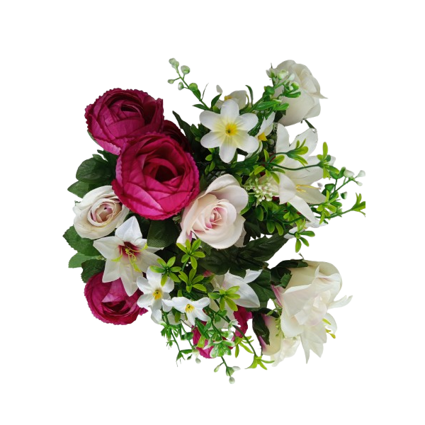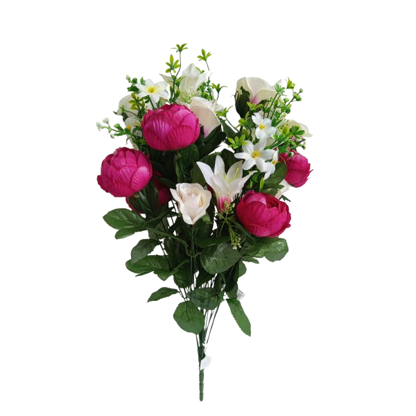 Kytice pivoněk (x6 květů), lilií (x6 květů), růží (x6 květů) atd.; v. 65 cm; moc pěkné, bohatě kvetoucí a věrohodné.