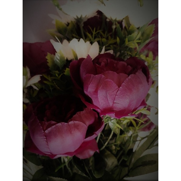 Kytice pivoňka + kopretina s přízdobou a palmovým listem, v. 60 cm; květ pivoně 7,5 cm, POSLEDNÍ KUSY