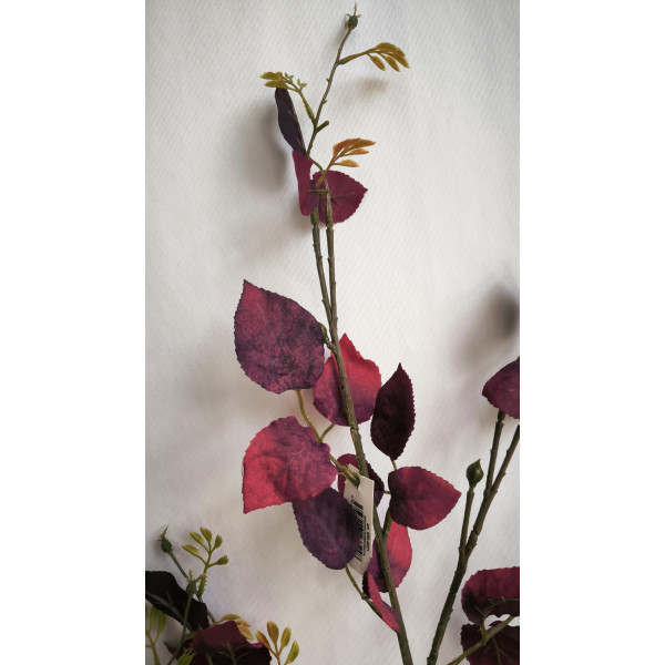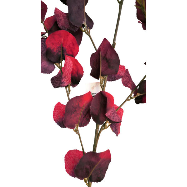 Větev eucalyptus v barvě burgundy, v. 95 cm; list 5x6 cm; mat. plast a textil; moc pěkné