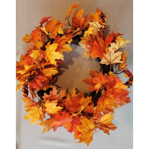 Věnec podzimní javorový, průměr 50 cm. korpus ze slabého proutí, listy textil; moc pěkný; poslední kusy skladem