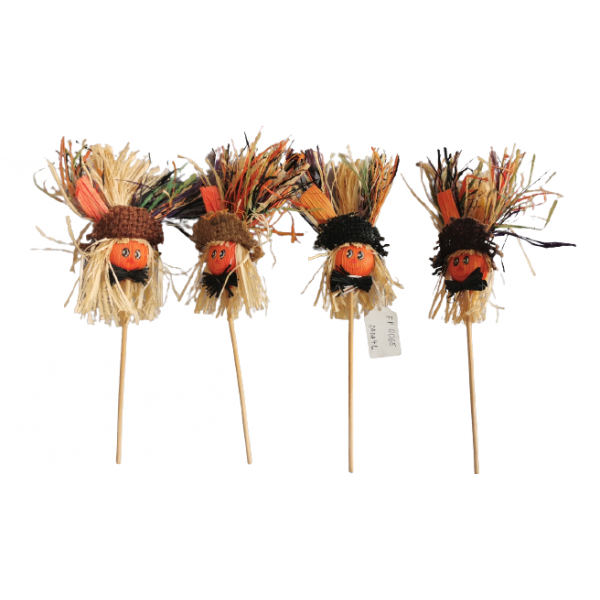 Strašák na tyčce. 4 různě barevné ks. Výška s tyčkou 22 cm, výška postavy strašáka 12 cm.