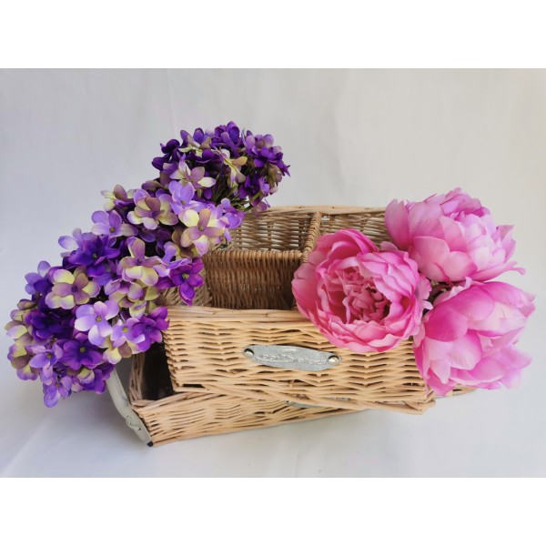 košík proutěný obdelník, dvoudílnýuši šedá umělá kůže, vhodné k aranžování květin na parapet. Druhé foto ilustrační. Košíkům sluší hortenzie, pivoňky,...