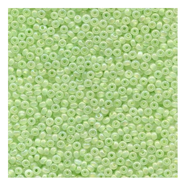 Rokail (rokajl, rocailles) - skleněné korálky. Velikost 9/0 = 2,7 mm. Barva: světle-zelená s AB dekorem. Kvalitní zboží české výroby.