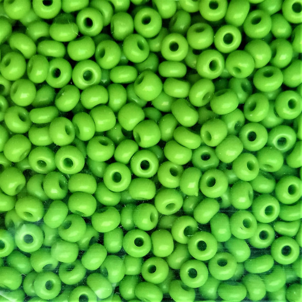 Rokail (rokajl, rocailles) - skleněné korálky. Velikost 7/0 = 3,4 mm. Barva: světle zelená - hrášková. Kvalitní zboží české výroby.