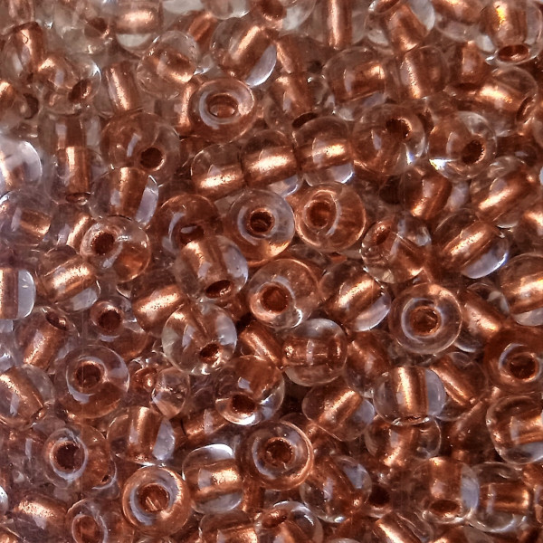 Rokail (rokajl, rocailles) - skleněné korálky. Velikost 6/0 = 4 mm. Barva: krystal - bronzový průtah. Kvalitní zboží české výroby.