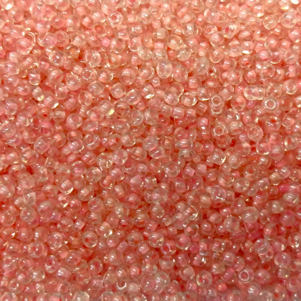 Rokail (rokajl, rocailles) - skleněné korálky. Velikost 11/0 = 2,1 mm. Barva: krystal s růžovým průtahem. Kvalitní zboží české výroby.