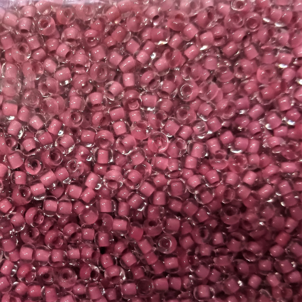 Rokail (rokajl, rocailles) - skleněné korálky. Velikost 9/0 = 2,7 mm. Barva: krystal se starorůžovým průtahem. Kvalitní zboží české výroby.