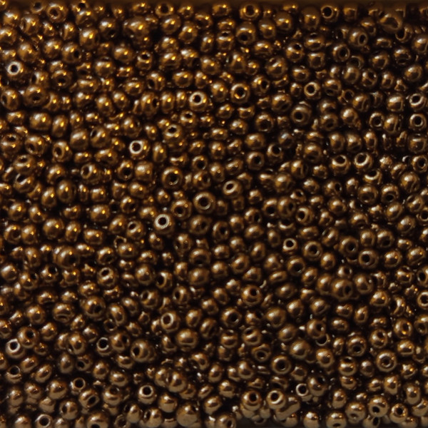 Rokail (rokajl, rocailles) - skleněné korálky. Velikost 11/0 = 2,1 mm. Barva: kovově bronzový. Kvalitní zboží české výroby.