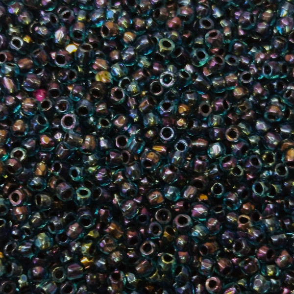 Rokail (rokajl, rocailles) - skleněné korálky. Velikost 10/0 = 2,3 mm. Barva: petrolejový iris, ploškovvaný. Kvalitní zboží české výroby.