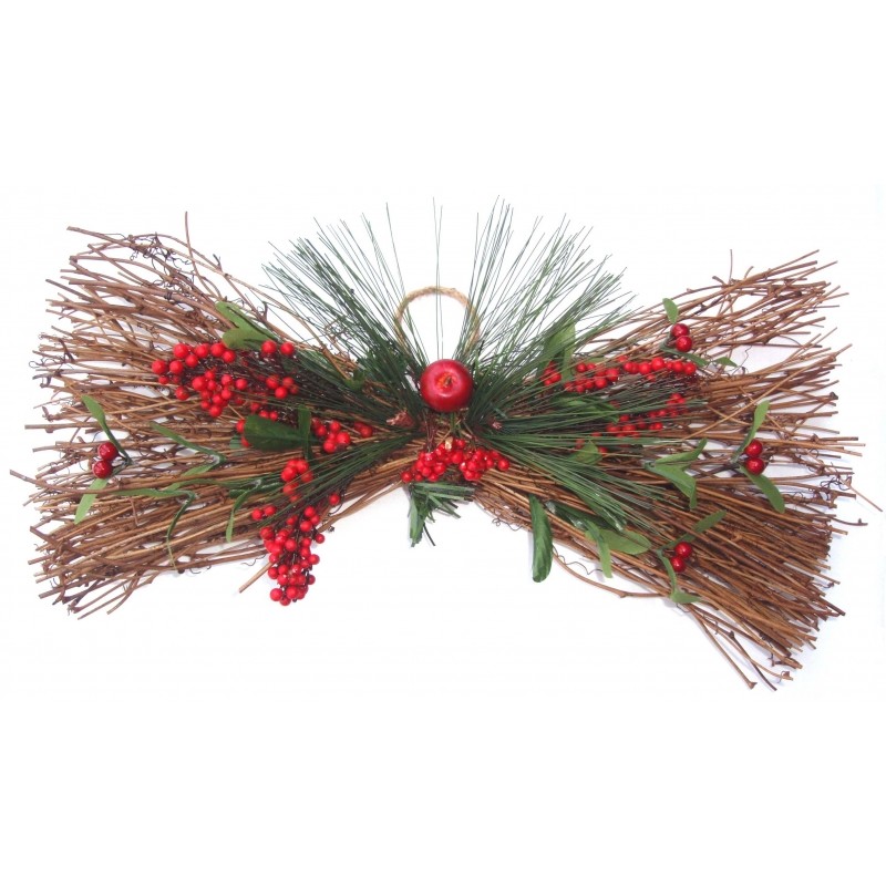 Závěsná dekorace z proutí zdobená jablíčkem a červenými bobulemi.