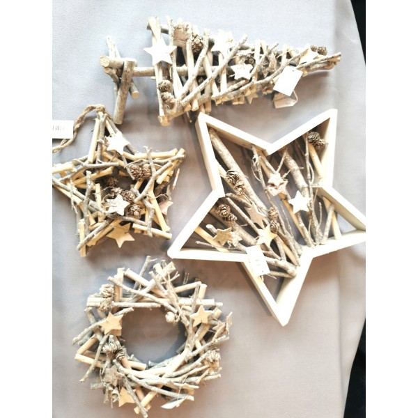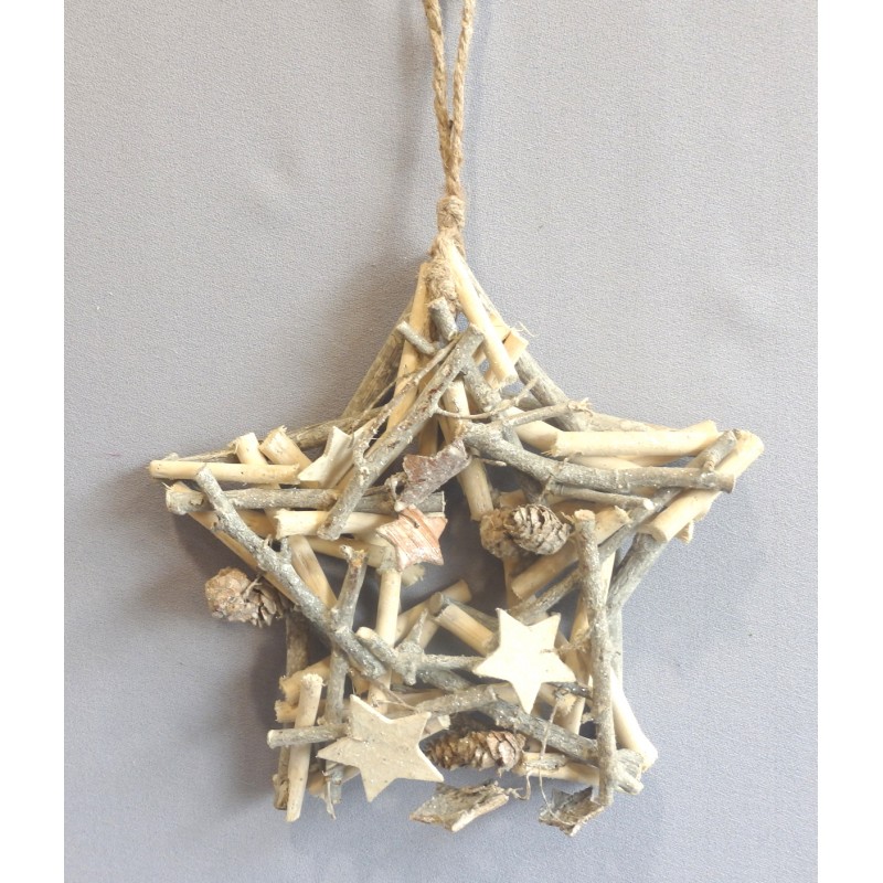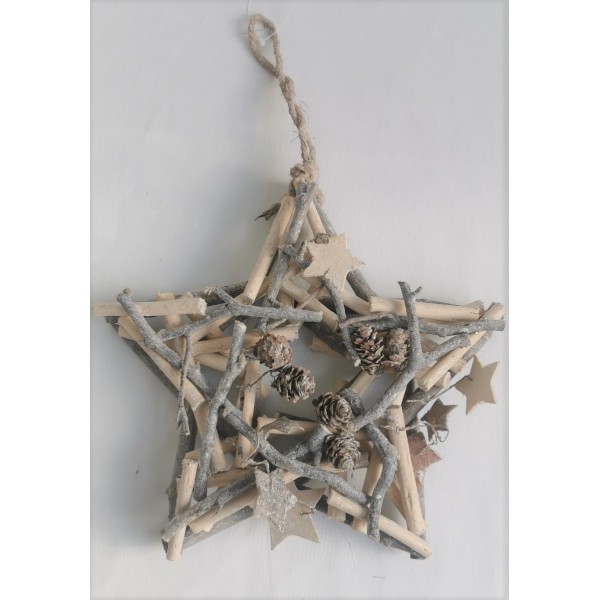 hvězda přírodní se šiškami a hvězdami "ojíněný vzhled"(větvičky, dřívka, proutí,šišky, hvězdičky, možno zavěsit)