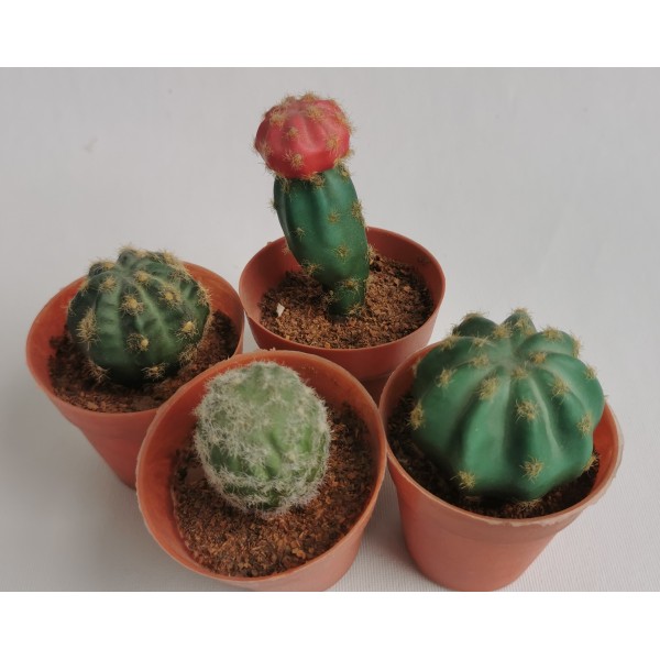 4 x malý kaktus (každý jiný) v setu. Cena za set. Výška nejvyššího i s květináčkem je 10 cm. největší kulatý má 8 cm na výšku. Materiál - vše plast.