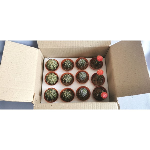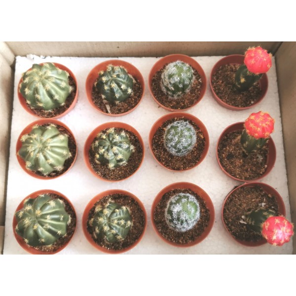 12 x malý kaktus v setu; 4 typy po 3 ks. Cena za set. Výška nejvyššího i s květináčkem je 10 cm. největší kulatý má 8 cm na výšku. Materiál - vše plast.