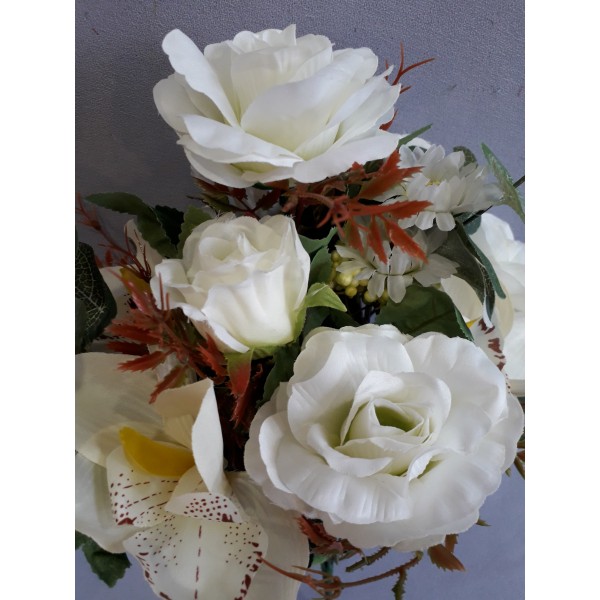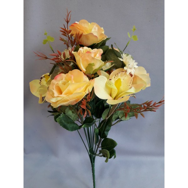 Růže kytice s orchideí, eukaliptem a přízdobou x 12 stonků, v. 45 cm, květ růže vel. 8x5 cm. Pěkné.