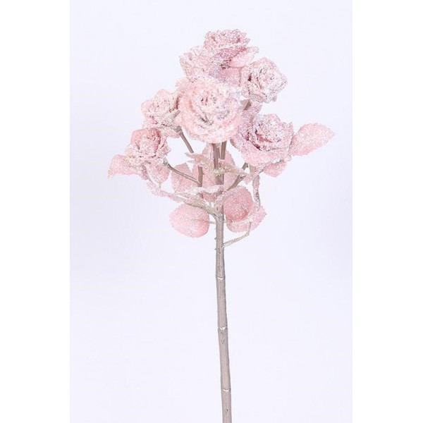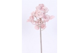 Růže kytička zasněžená s glitry. Drobné květy. V. 40 cm; květ 4,5 cm. Stonek barvy platiny; květy a listy barva růžová.