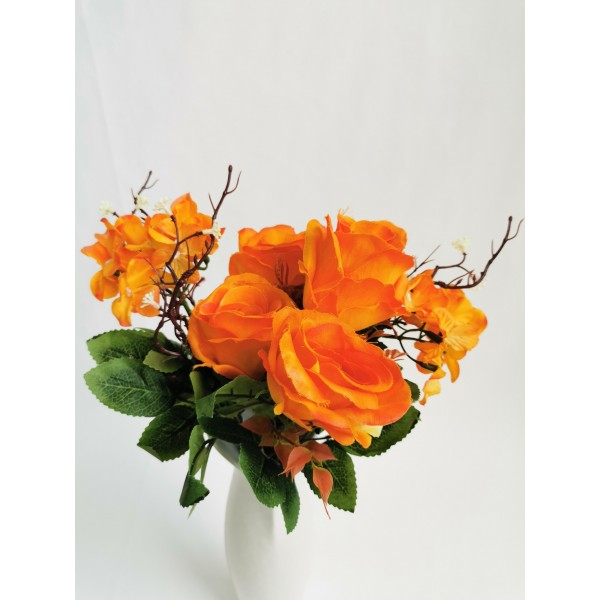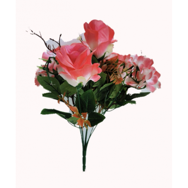 Kytice růže mix s hortenzií. Celkem 7 květů + přízdoba. Materiál je textil a plast. V. 46 cm; květy 8x7 cm. Moc pěkné. 6 barevných variant.