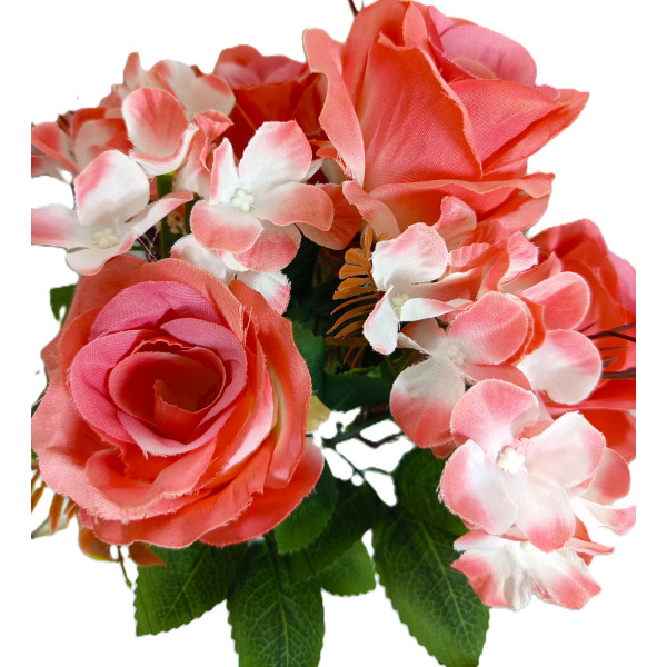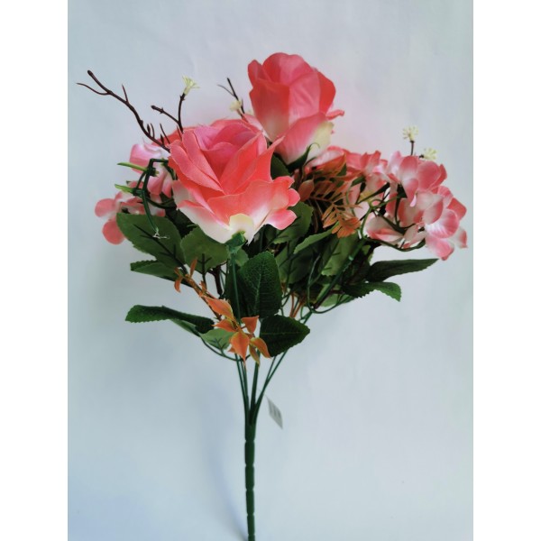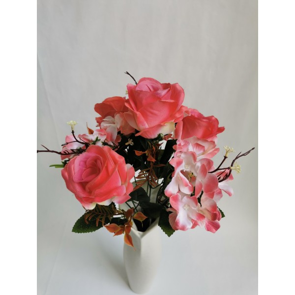 Kytice růže mix s hortenzií. Celkem 7 květů + přízdoba. Materiál je textil a plast. V. 46 cm; květy 8x7 cm. Moc pěkné. 6 barevných variant.