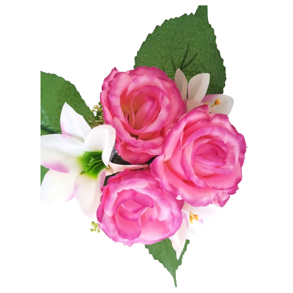 růže kytice x7 stonků (4x růže + 3x lilie), výška 32 cm; květ cca 9 cm